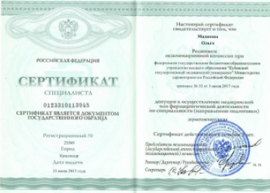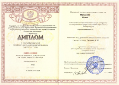 2017 г. - Кубанский государственный медицинский университет Министерства здравоохранения Российской Федерации г. Краснодар, интернатура «Врач дерматовенеролог».