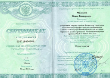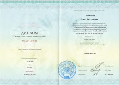 2018 г. – профессиональная переподготовка на базе Центральной государственной медицинской академии Управления делами презедента Российской федерации по специальности “Косметология”.