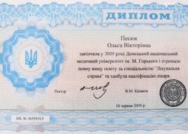 2003 — 2009 г.г. - Донецкий национальный медицинский университет им. М. Горького, специальность «Лечебное дело» - врач.