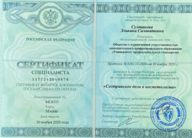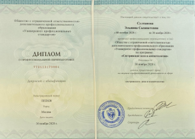 2020 г. - профессиональная переподготовка на базе Университета профессиональных стандартов, г. Москва по специальности "Сестринское дело в косметологии".